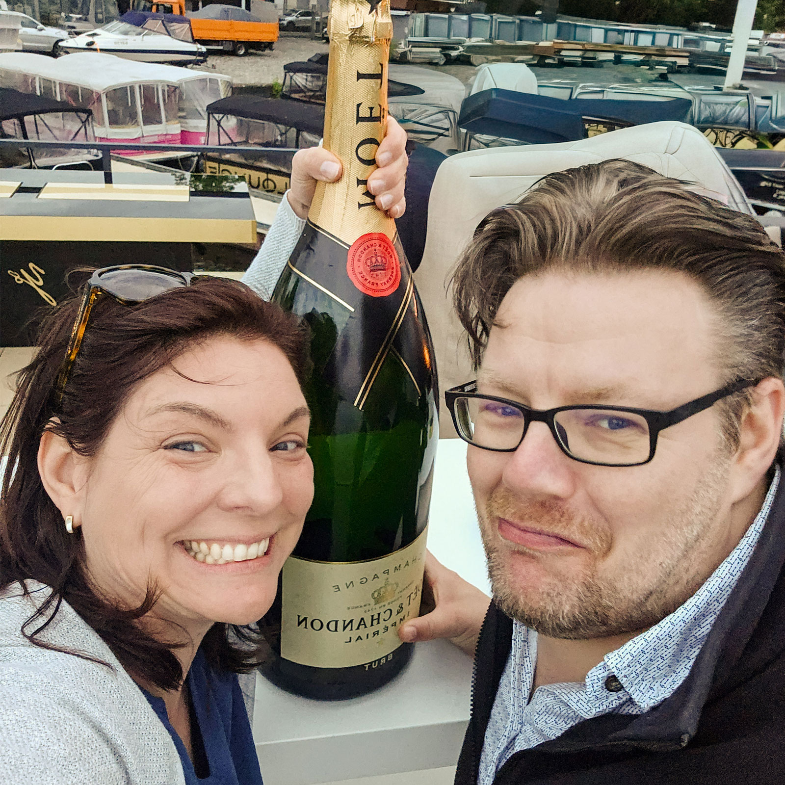 Auf dem Foto siehst du uns mit einer überdimensionalen Champagnerflasche. Das ist kein Zufall. Denn genau so fühlt sich unser Podcast an: